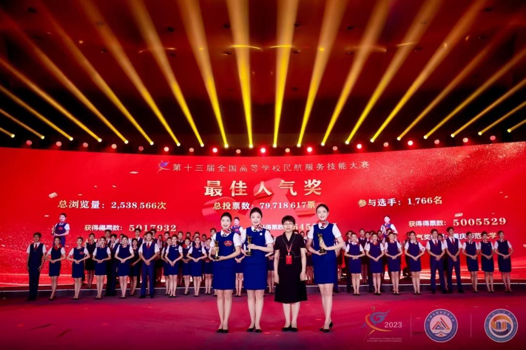 代表队在本次大赛中喜获团体综合季军、航空知识与英语三等奖以及“高等学校航空类专业就业工作先进单位”荣誉称号。此外,在个人奖项的角逐中,我校汤垚同学荣获最佳人气奖 第三名。闭幕式晚会上同学们的精彩表现获得了在场嘉宾的一致肯定,展示出我校航空服务艺术与管理专业学子优秀的综合素质。