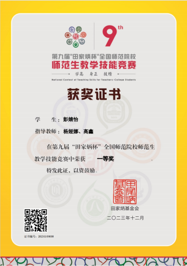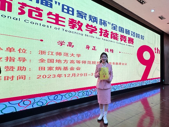 2023年12月29-31日,第九届“田家炳杯”全国师范院校师范生教学技能竞赛决赛在浙江师范大学举行。经初赛和决赛两轮角逐,在杨娅娜老师和高鑫老师的指导下,2020级地理科学(师范)专业彭婧怡同学荣获一等奖。
