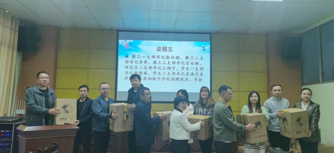 (学院各支部书记代表学院为白鹿初级中学捐赠教具、书籍)