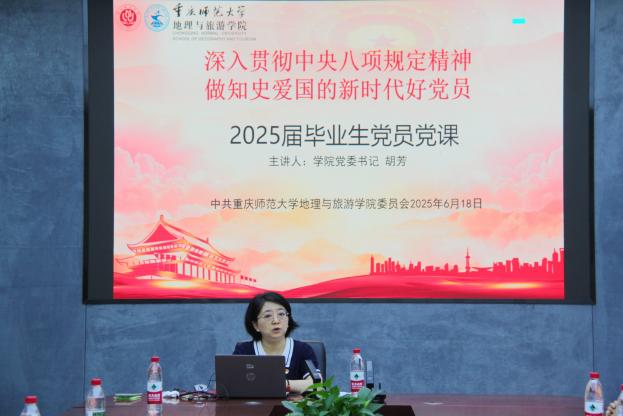 党委组织开展2025届毕业生党员“七个一”教育实践活动之专题党课。本次党课以“深入贯彻中央八项规定精神、做知史爱国的新时代好党员”为主题,学院党委书记胡芳主讲,39名毕业生党员及党委副书记、组织员共同参加。