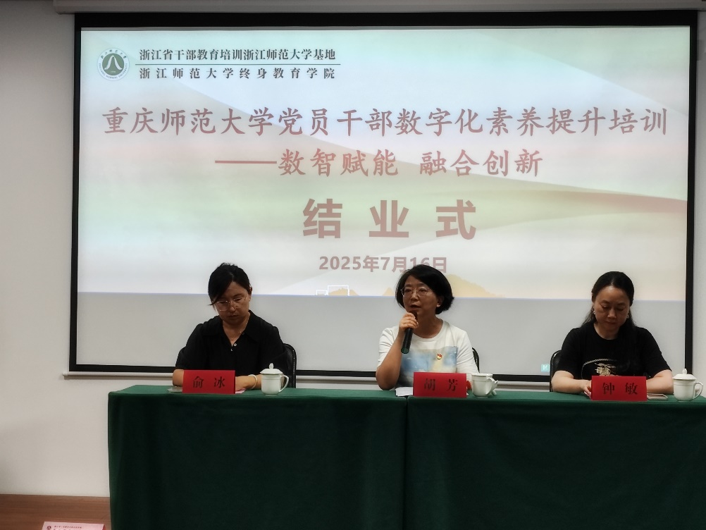 党委书记胡芳作总结讲话。胡书记首先代表全体学员向浙江师范大学终身教育学院的精心组织、周密安排及授课专家、带班教师的辛勤付出表示衷心感谢。她高度评价此次培训内容丰富、针对性强,紧扣“数字化素养提升”核心,是学校落实“13649”发展思路、激发党员教师进取精神的重要举措。胡书记表示,本次培训纪律严明、学风端正,学员们潜心学习,严守纪律,最终学有所获。胡书记强调,此次培训不仅是用数字重构个体认知的智慧启迪,更是碰撞融合凝聚力量的思想动员。她向全体学员提出殷切期望,要将学习成果转化为推动落实学校各项工作的实际成效,勇担强国使命,追求卓越发展,为“加快打造西部地区师范名校”贡献力量!