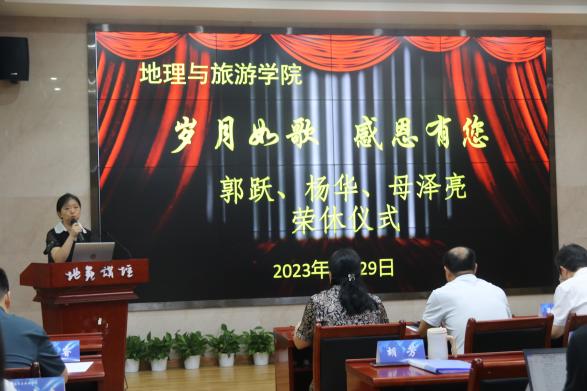 ,风华正茂,光彩耀人,自投身教育事业,就默默耕耘,不计得失,于平凡之处见伟大,于细微之中显精神,为学院、为学校的发展做出许多重要贡献。吴佳贵副处长为在场的郭跃老师、杨华老师颁发了荣休证书和纪念品,并表达了对三位老师的敬意和祝愿。校工会刘涛副主席向在场的两位老师赠送了荣休纪念册、礼品与鲜花,感谢三位老师为学院、学校所做出的贡献并表示三位老师永远是工会的一员。学院在职教师汪洋、刘睿、杨永丰代表全体教师回顾了与三位老师一起度过的难忘岁月,表达了对三位教师的崇高敬意和感恩之情,送上了美好祝愿。在场的郭跃老师、杨华老师分别发言,回忆了在学校工作以来的点点滴滴,他们抚今追昔,感谢学院学校对他们的培养,言谈中饱含着对教育科研事业的忠诚与热爱,深蕴着对学校发展的期望,充满着对学院学校的深深眷念,对同事的深深情谊,对后辈的深切关爱。远在海外的母泽亮老师录制了祝福视频,期望学院在年轻老师们的努力下发展壮大。