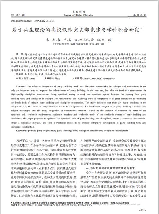 【党建研究】《基于共生理论的高校教师党支部党建与学科融合研究》党建论文发表