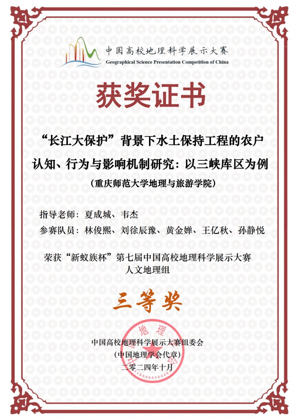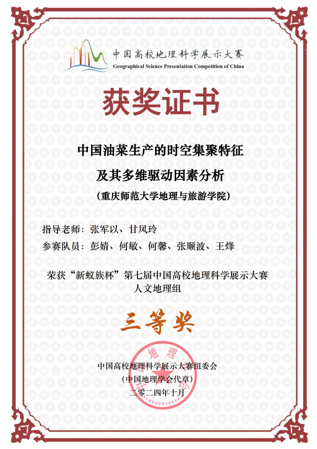 在人文地理组中,海角网 2022级、2023级彭婧,何敏,何馨,张顺波,王烽组成的“油菜花”队(指导教师:张军以、甘凤玲);海角网 2022级、2023级林俊熙,刘徐辰豫,黄金婵,王亿秋,孙静悦组成的“长江绿梦守护者”队(指导教师:夏成城、韦杰)均在本次大赛中获得全国三等奖。