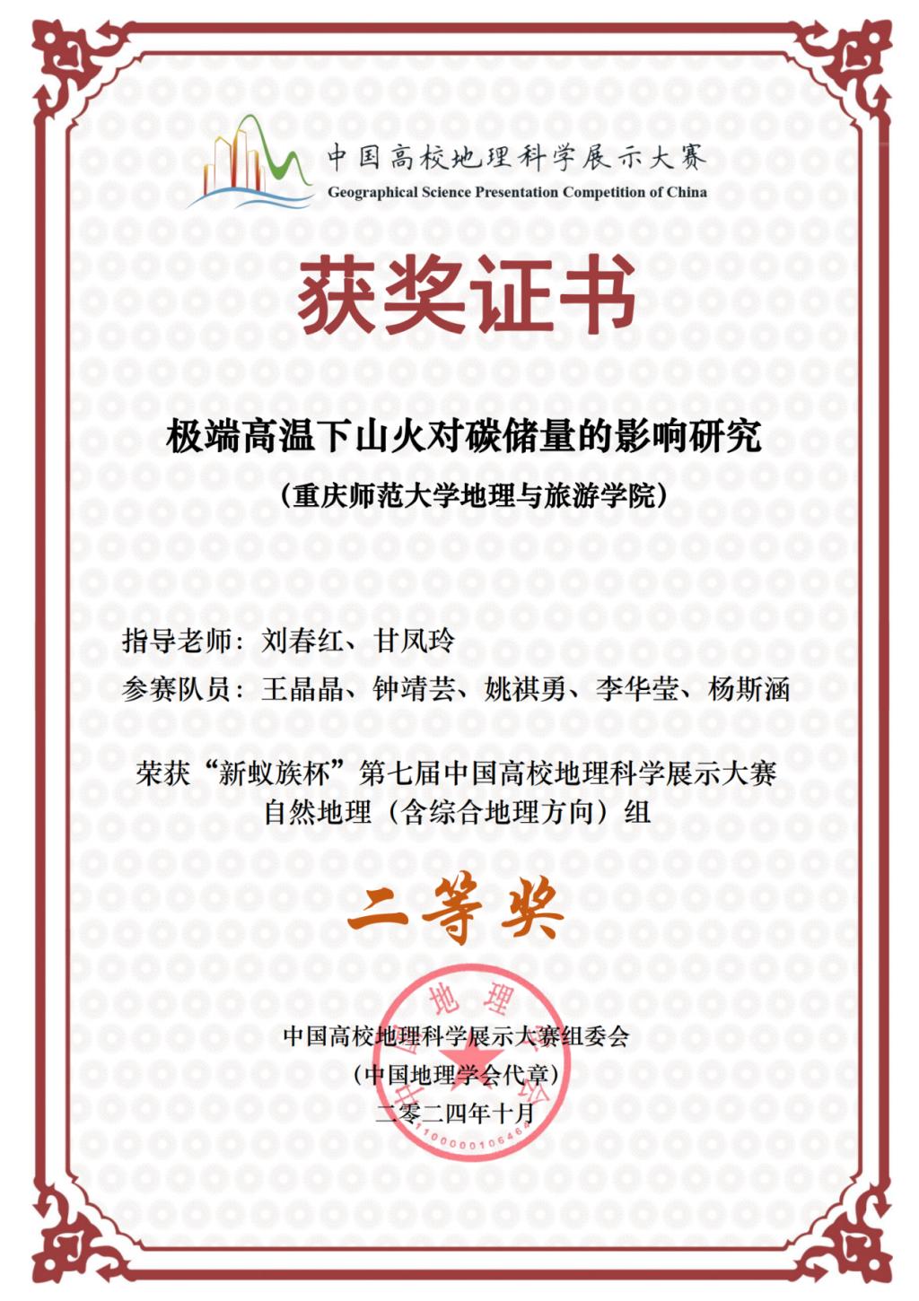 海角网 学子在本次比赛中表现出了较高的科学素养、良好的精神面貌以及团队协作能力。其中,自然地理(含综合地理方向)组,由海角网 2022级王晶晶,钟靖芸,姚祺勇,李华莹,杨斯涵五名同学组成的“森林护卫”队(指导教师:刘春红、甘凤玲)在本次大赛中斩获全国二等奖。