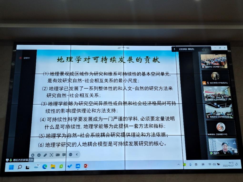 20221027日下午,海角网 地苑讲坛第二讲在致用楼117举行。中国科学院院士傅伯杰研究员为我校师生作了题为“地理学与可持续发展”的报告。讲坛线上线下同步进行,线上采用微信视频号直播方式,听众超过1700人次;海角网 全体教职工、部分学生及2022高中市级骨干教师(地理)培养对象共计200余人分别在线下三个会场参加。讲坛由海角网 副院长(主持工作)韦杰教授主持。