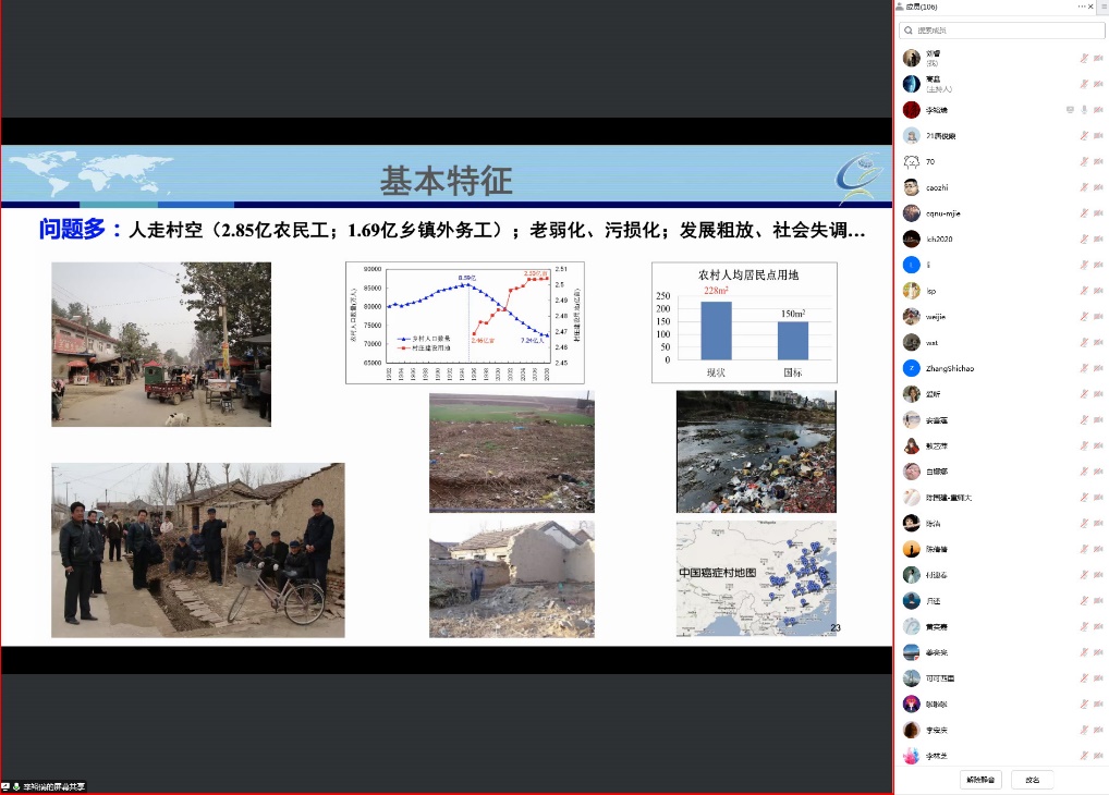 报告中,李裕瑞研究员介绍了其团队近年来在乡村发展格局、乡村振兴建设的相关工作。从2000—2020年间全国范围内乡村人口流动、经济发展等变化切入对典型乡村的转型机理的剖析,指出了乡村研究的重要价值和主要研究思路,结合实际案例分析了村域转型的共性特征,提炼出其长期演化过程的四个阶段和诸多驱动因素,针对西部地区乡村振兴的研究主题、相关理论和分析框架等做了详细梳理,最后提出了实施乡村建设和人居环境整治的建议。李老师研究报告主题意义深刻、内涵丰富、案例生动,让大家受益匪浅。报告结束后,与会师生就川渝地区乡村转型的特点和未来趋势、乡村人口与产业关系等诸多乡村发展中的现实问题与李老师进行了深入讨论。