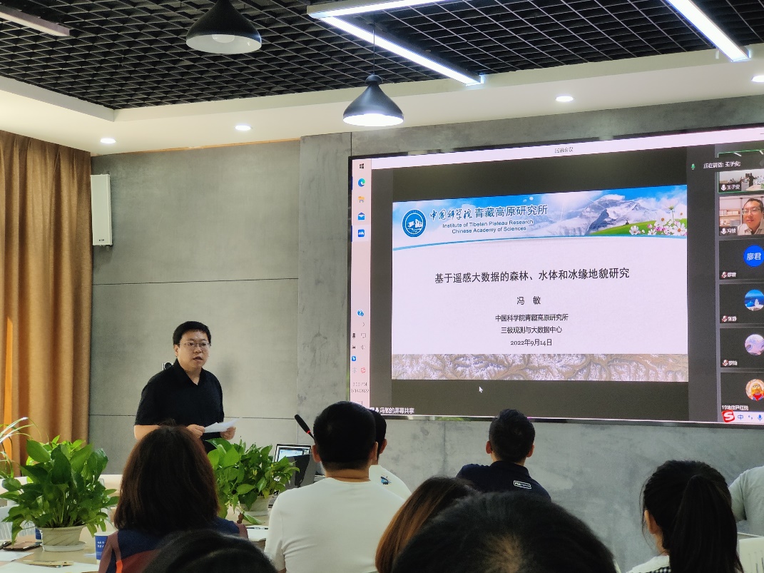 冯敏研究员以“基于遥感大数据的森林、水体和冰缘地貌研究”为题,首先引入了遥感大数据的概念和介绍了遥感大数据的现状,接着分享了基于遥感大数据在森林冠层覆盖度、水体时空变化和冰缘地貌调查等方面开展的系列研究工作。