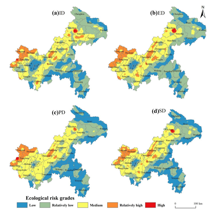 对未来景观生态风险的研究发现,自然发展情景下重庆市景观生态风险较为严峻,而采取了生态保护措施后,景观生态风险得到较大改善。