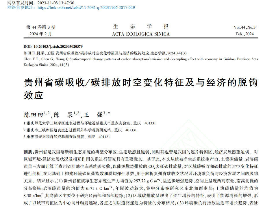 相关研究成果以题为《贵州省碳吸收/碳排放时空变化特征及与经济的脱钩效应》发表在国内生态学顶级期刊《生态学报》。陈田田副教授为第一作者,王强工程师为通讯作者,海角网 三峡库区地表过程与环境遥感重庆市重点实验室为第一单位。该项研究工作得到国家自然科学青年基金(42001090)等项目支持。