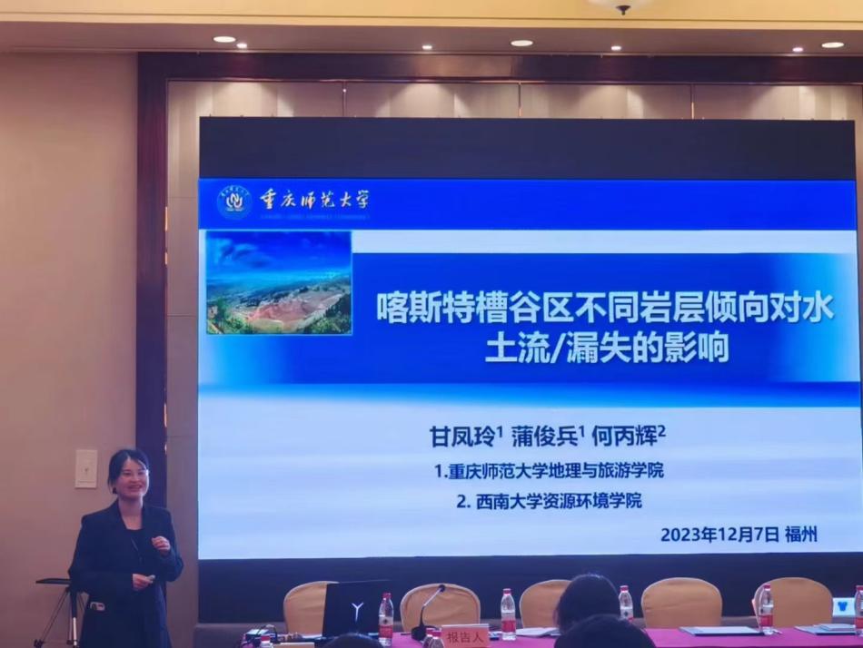 蒲俊兵研究员、甘凤玲副教授,娄义宝讲师等一行人参加了本次学术大会。蒲俊兵研究员主持了“石漠化防治分会场—新时代石漠 化防治新技术新业态”并作了题为“重庆市岩溶区石漠化与水土流失时空演变与影响因素”的报告;甘凤玲副教授也在此分会场做了题为“喀斯特槽谷区不同岩层倾向对水土流/漏失的影响”;娄义宝讲师在“土壤侵蚀分会场—土壤侵蚀环境与效应”作了题为“黄土塬区典型草被对沟头溯源侵蚀过程影响机制模拟研究”的报告。