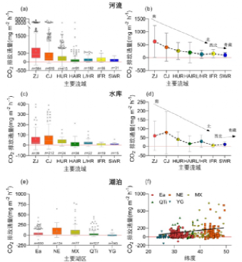 (图2 中国河流(a、b)、水库(c、d)、湖泊(e、f)水体fCO2的地理分异特征)