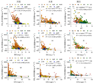 论文主要结果如下:中国河流、湖泊、水库fCO2变异性极强,变化范围分别为-379.3~4947.6、-160.1~785.0及-74.0~1603.1mgCO2m-2h-1,中值分别为228.5、26.0和28.3mgCO2m-2h-1,河流远高于湖泊和水库;受气候条件的影响,河流与水库fCO2表现为自南向北降低的趋势,珠江、长江流域最高,东北诸河最低;湖泊水体fCO2表现为蒙新湖区和东北湖区略高,青藏湖区略低,东部、云贵湖区最低,湖区自然特征及人类活动导致湖泊水体初级生产的增强是造成湖区间差异的主要驱动因素。
