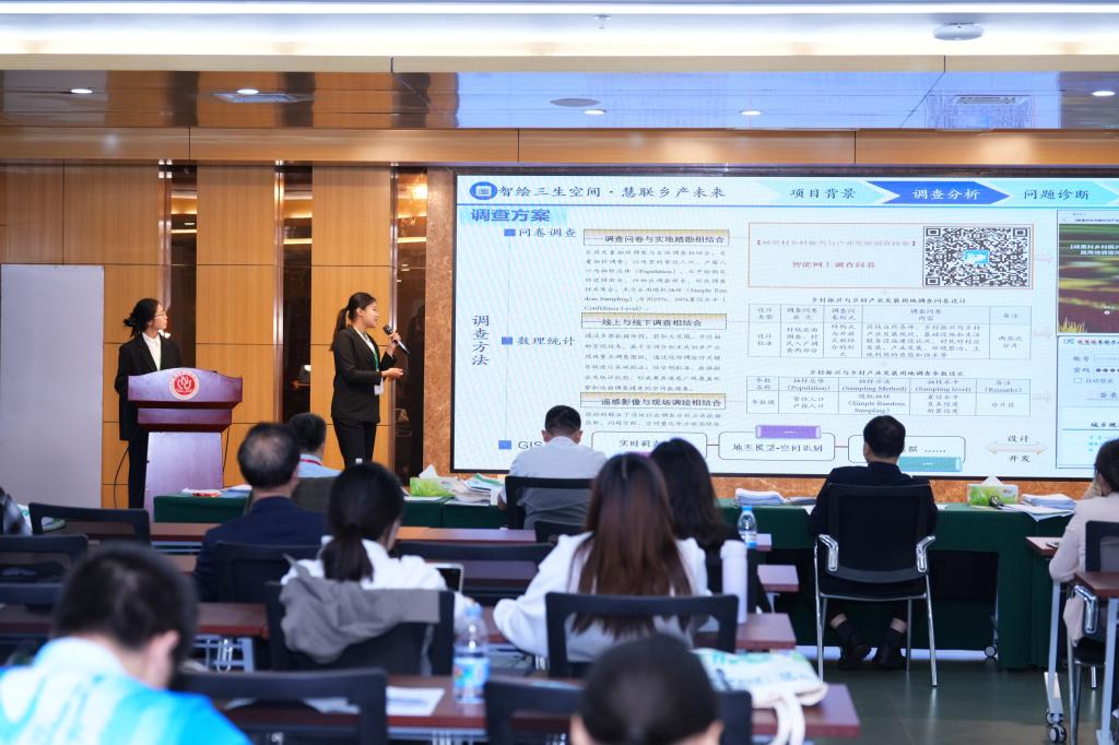 本届大赛分4组在2个赛场同步开展。分组赛各参赛团队紧密围绕“数智驱动与绿色未来”这一主题,带来了涵盖生态修复、水资源管理、绿色发展、碳中和、智慧农业等领域的科技作品。现场答辩精彩纷呈,学子们通过扎实的数据分析、精准的模型构建和创新的解决方案,生动演绎了如何以数智科技赋能自然资源治理现代化,为绿色未来发展提供了富有创见的青年智慧。