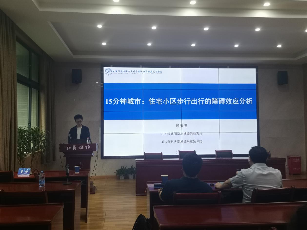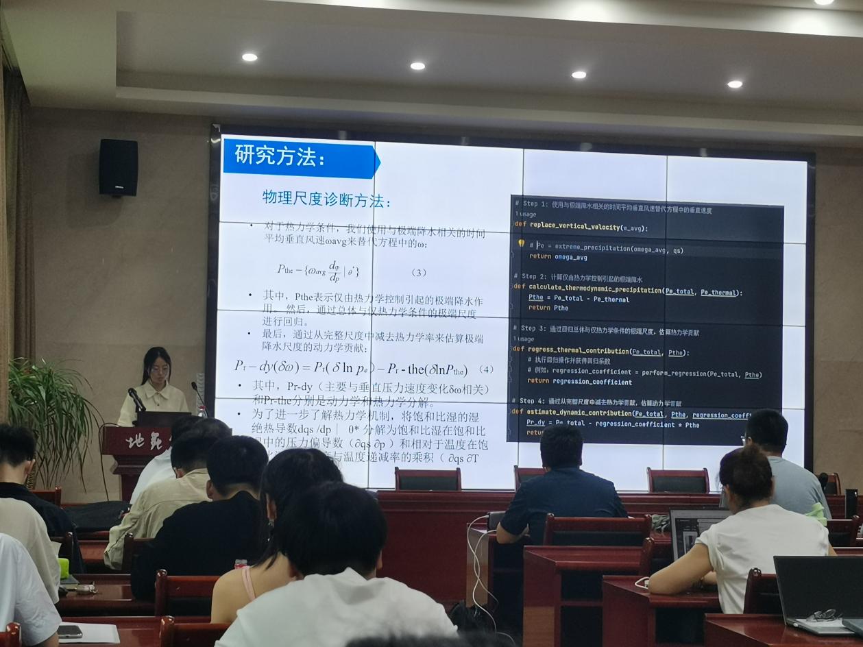 汇报环节,同学们展示了近期工作进度、阶段性研究成果和工作计划。本次汇报涵盖公共服务测度、障碍效应、极端气候、交通出行、生态安全和土壤侵蚀等多个研究主题,涉及方法包括LMDI模型、InVEST-PLUS模型、DSSAT模型等,充分体现了地理学科与地理时空大数据相结合的研究理念。同时,研究区域涉及了三峡库区、长江经济带、中亚地区、全球等多尺度,深化了师生对区域差异的理解。