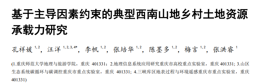 人文地理学专业研究生孔祥媛基于多源空间数据及行政村统计数据,通过聚落承载力、粮食承载力和产业承载力分析,构建了“聚地产”三元约束视角下土地承载力测评算法,定量分析了案例区域的土地资源综合承载力。研究成果以“基于主导因素约束的典型西南山地乡村土地资源承载力研究”为题发表在《农业资源与环境学报》上。GIS应用创新团队研究生孔祥媛为第一作者,汪洋老师为通讯作者。