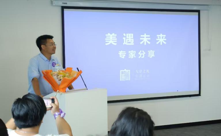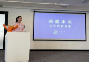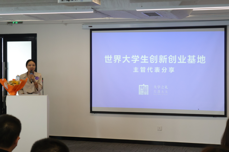 世界大学生创新创业基地代表文老师随后发表讲话。她详细介绍了基地作为国家级平台的核心优势、完善的孵化服务体系以及为创新创业项目提供的全方位支持。文老师承诺,基地将成为美遇未来平台发展的坚实后盾,提供包括空间、资源对接、政策咨询等在内的强力支撑,期待并坚信美遇未来将在基地的滋养下“绽放更耀眼的光芒”。