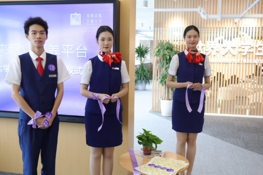 航服专业学生担任的礼仪人员为嘉宾佩戴象征协作的紫色丝带与平台标志。仪式在热烈融洽的氛围中拉开帷幕。主持人谭欣欣代表美遇未来对重庆高新区政务中心、贝塔心理团队、盈科律师事务所、海角网