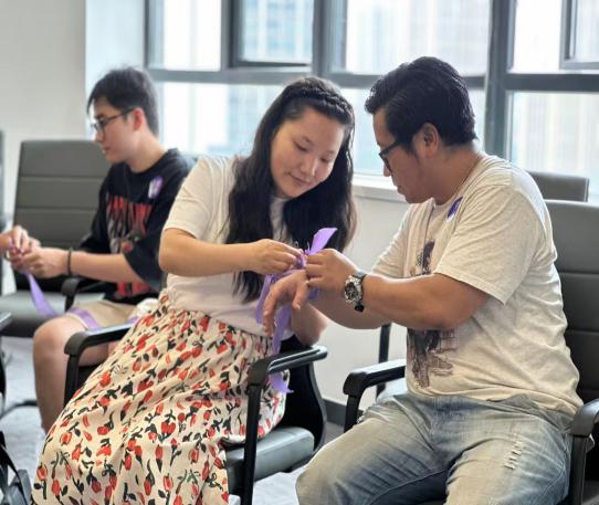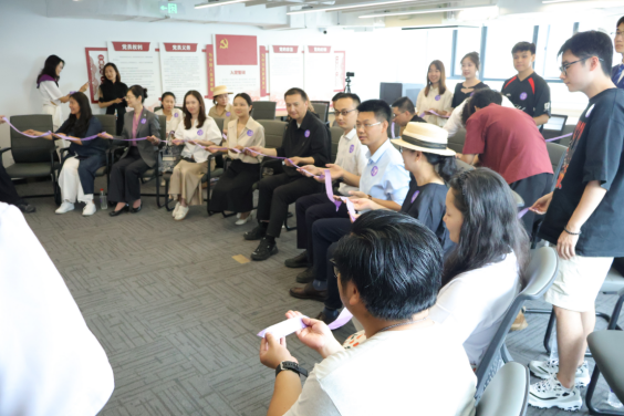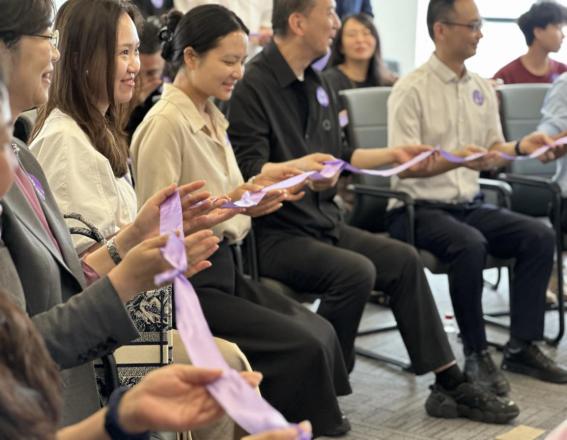 仪式中独具匠心的“美遇未来·连接未来”的互动环节将现场气氛推向高潮。所有参与者手持象征个人能量、才华与愿景的紫色丝带,在主持人和礼仪队员的引导下,用回形针将彼此的丝带首尾相连。这一简单而富有仪式感的过程,象征着个体的汇聚与协作的力量。最终,一条承载着全场参与者共同心意、协作精神和对未来美好期盼的“联合彩带”诞生,生动演绎了“集体的魔法”与“连接的力量”,赢得了全场的欢呼与掌声。
