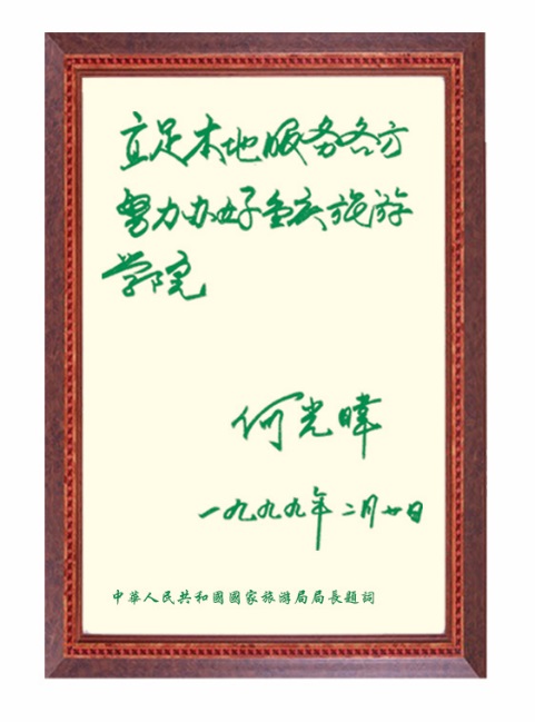 时任国家旅游局局长何光暐亲笔题词祝贺“重庆旅游学院”正式挂牌