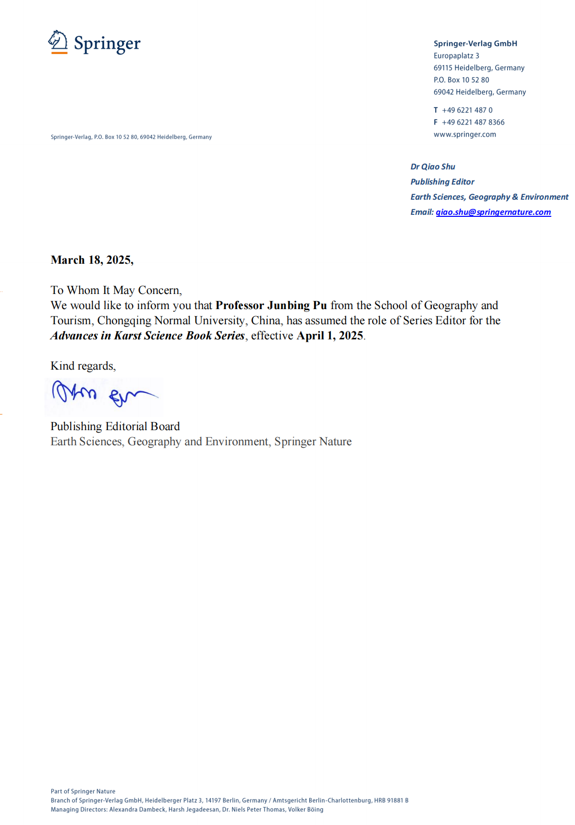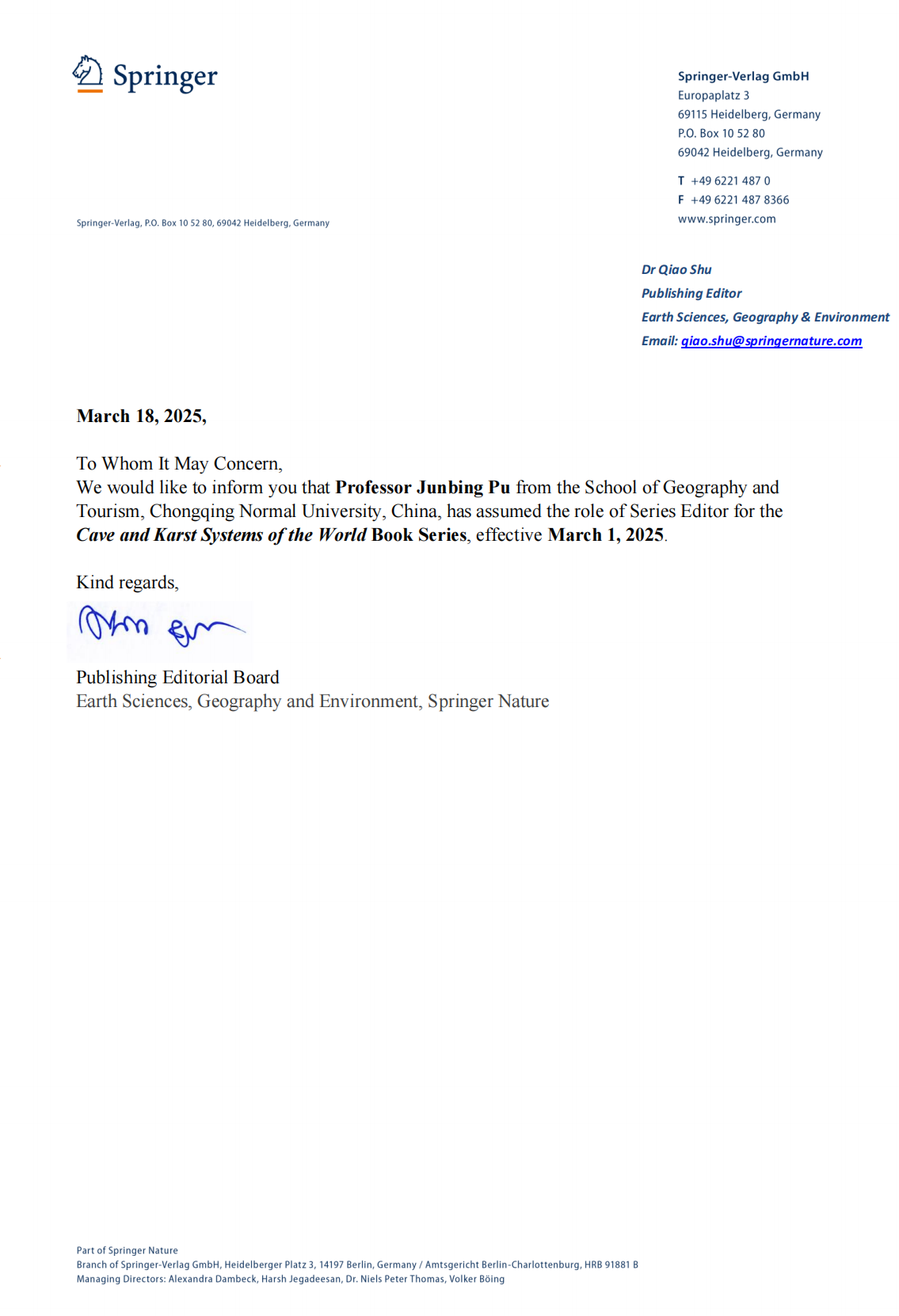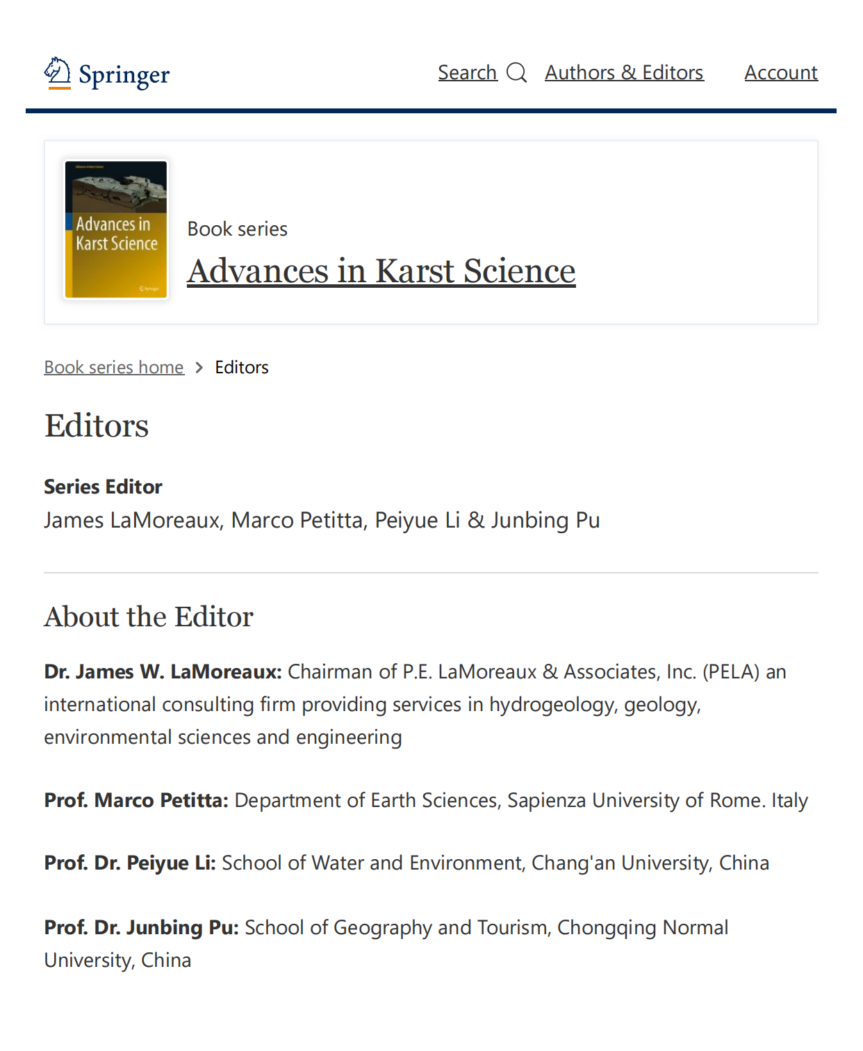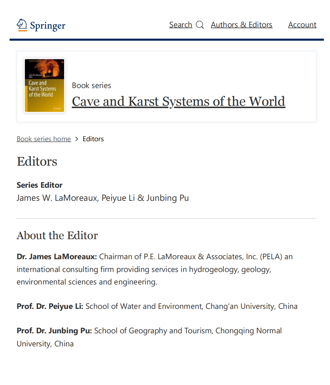 蒲俊兵研究员受邀担任《Cave and Karst Systems of the World》和《Advances in Karst Science》两套丛书的共同主编。两套丛书是当前国际岩溶学界最重要的影响力最大的两套书系。《Cave and Karst Systems of the World》属于区域岩溶学领域,侧重于全球各个国家或地区、重要岩溶区的相关研究成果的总结。《Advances in Karst Science》侧重于前沿成果总结,主要是总结介绍岩溶学相关领域的最新进展、最新技术和发展趋势。