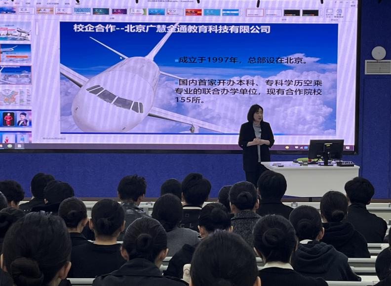 工作处副主任毛文静老师介绍专业师资团队、校企合作方北京广慧金通教育科技有限公司提供的教学设备以及前往阿提哈德航空培训学院学习的经历和历届学长学姐参加各类特色活动的精彩表现。