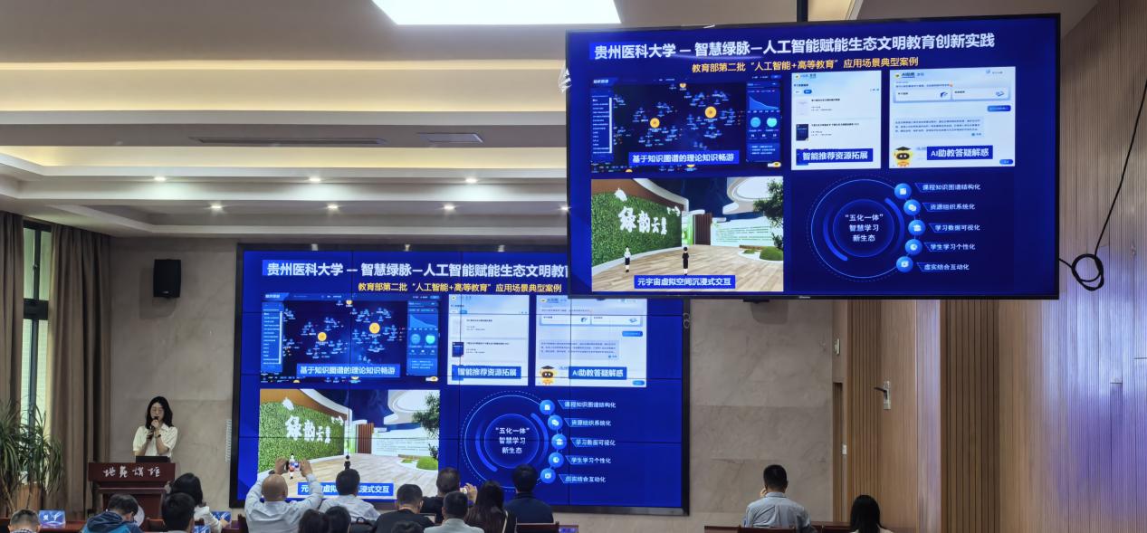 在“AI赋能教学新范式”环节,杨芬老师系统阐释了人工智能技术在教学场景中的创新实践。教育教学大模型可以实现线上线下混合式教学,有效提高学生课堂参与度,帮助教师精准掌握学情,及时调整教学策略。教学数字化系统覆盖“教学设计、课堂实施、效果评估”全流程,贯穿课前预习、课中互动、课后巩固全场景,显著提升了教学效率和精准度。