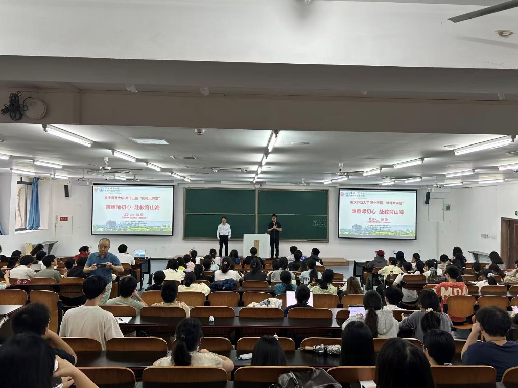 第十三期“优师大讲堂”在砺志楼-T2113教室举行,本次讲座由重庆市云阳县委教育工委委员、教委副主任陈荣作为特邀主讲嘉宾,以“秉重师初心,赴教育山海”为主题,学校230余名优秀教师定向培养专项计划的学生(以下简称“优师生”)参加,地理与旅游学院副院长张云耀教授主持活动。