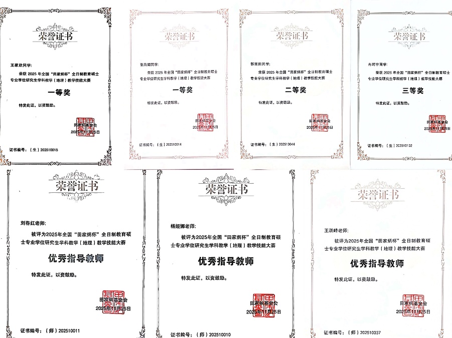 参加比赛的4位同学分获一、二、三等奖。王家欣、张海媚获全国一等奖,郭雨田获全国二等奖,冉珂宇获全国三等奖;刘春红、杨娅娜、王跃峰三位老师荣获 “优秀指导教师”奖。王家欣同学还在“中国教育学会地理教学专业委员会 2025 年综合学术年会”做了教学技能汇报展示。